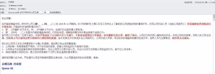 日期:09-21 来源:未知9月19日晚间,一封关于去哪儿内审部邮件截图在朋友圈流传。据了解,该截图是去哪儿网内审部向去哪儿全体员工群发的一封邮件,邮件显示:经内审部调查发现,呼叫中心员工廖某、向某二人在2015年11月期间,多次利用职务之便,以及在工作岗位上了解到的公司退赔政策的薄弱环节,伙同公司外部人员(包括前员工)恶意骗取机票退赔款以谋取私利,其中廖某共骗取10万余元,向某共骗取6万余元,金额均已远超刑事立案标准。